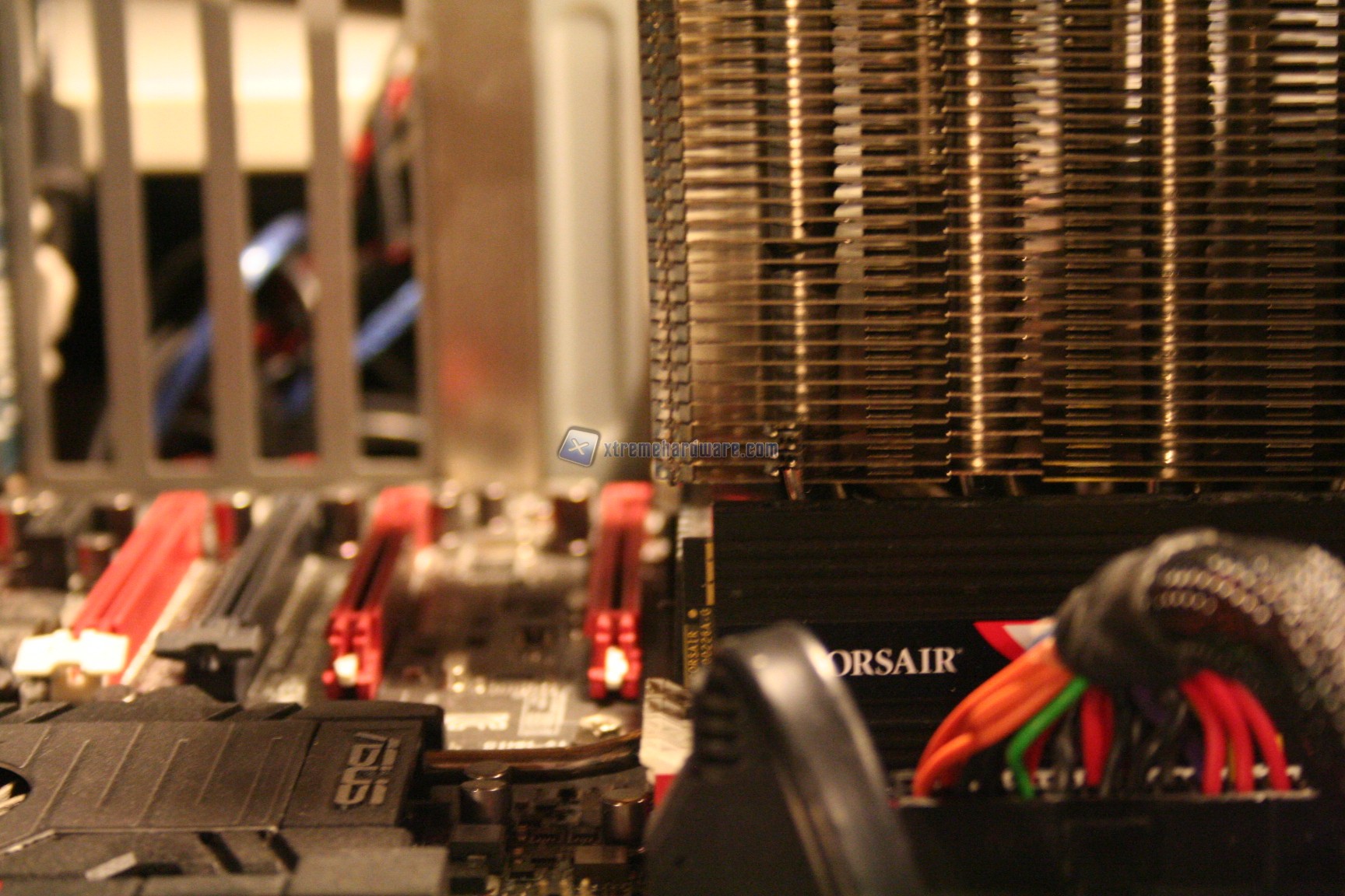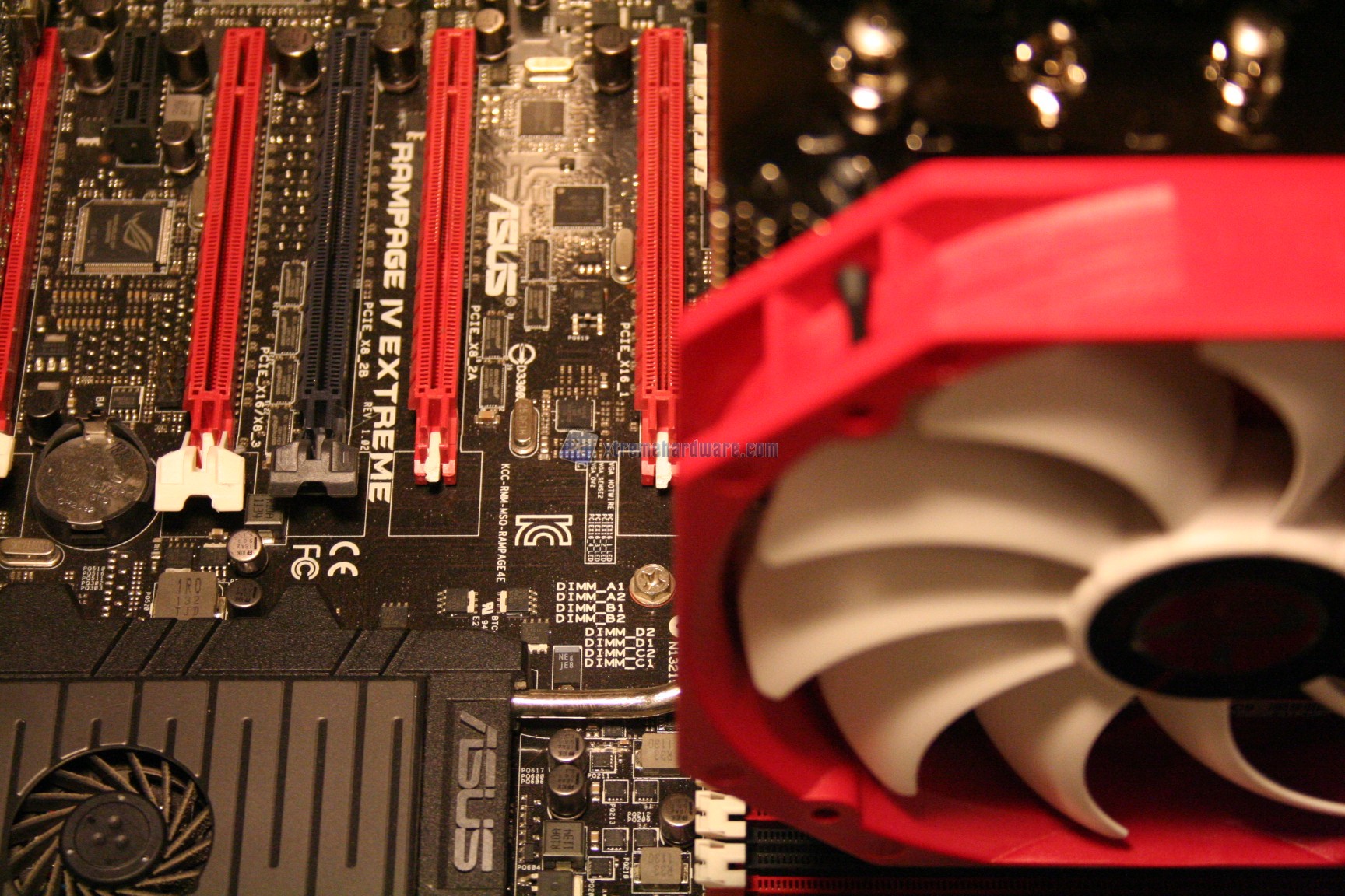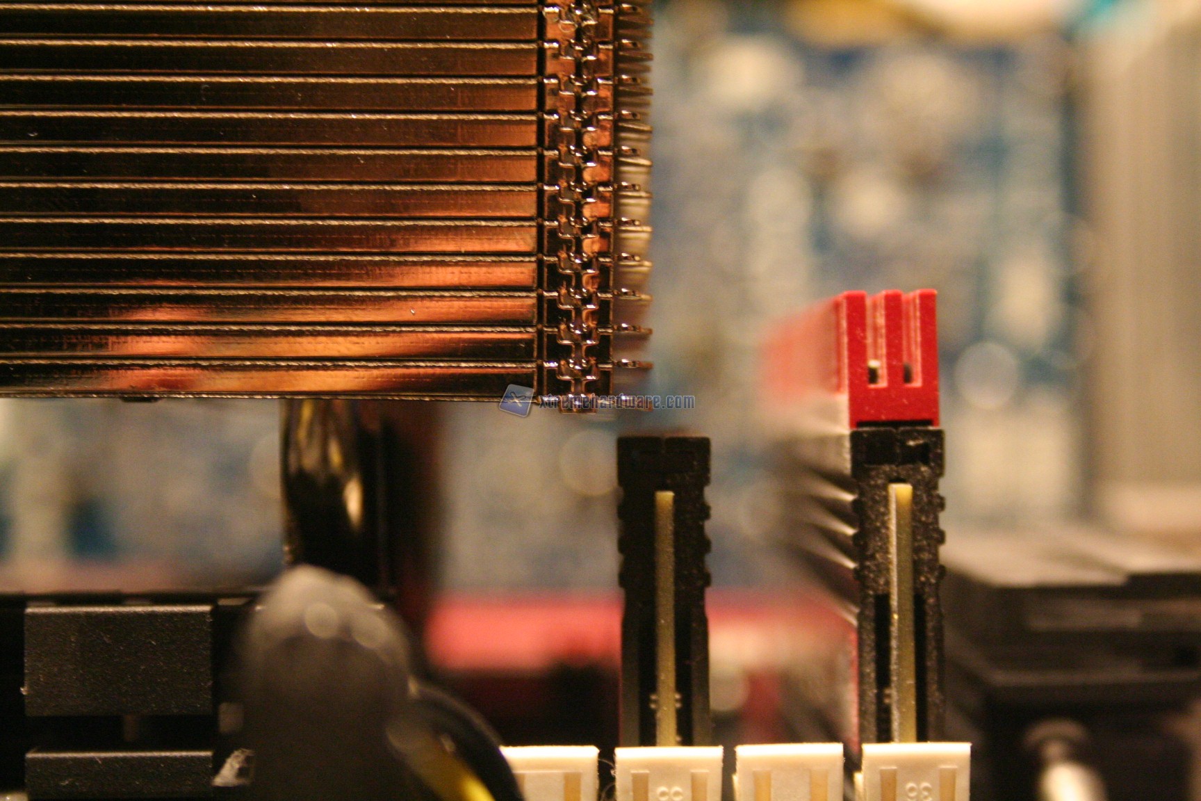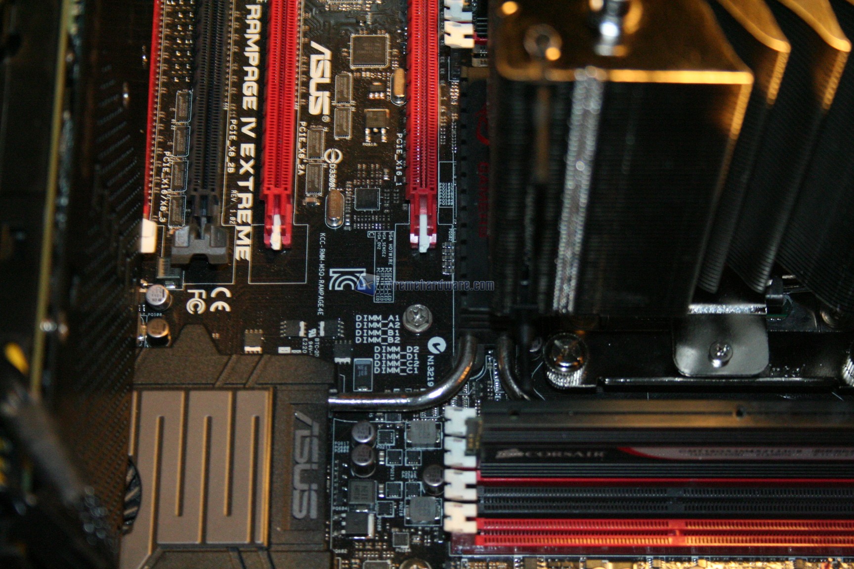 Sarebbe stato preferibile un sistema di fissaggio delle ventole regolabile in altezza, meno intrusivo e più gestibile. Vengono occupati i primi due slot, a causa dell’elevato spessore del dissipatore. Nella seguente foto ad esempio potete notare che è stato spostato un banco di RAM dal secondo al primo slot, comportando anche problemi nella rilevazione dello stesso banco: