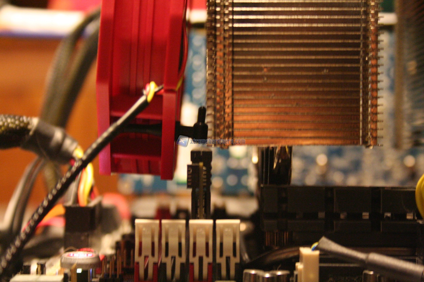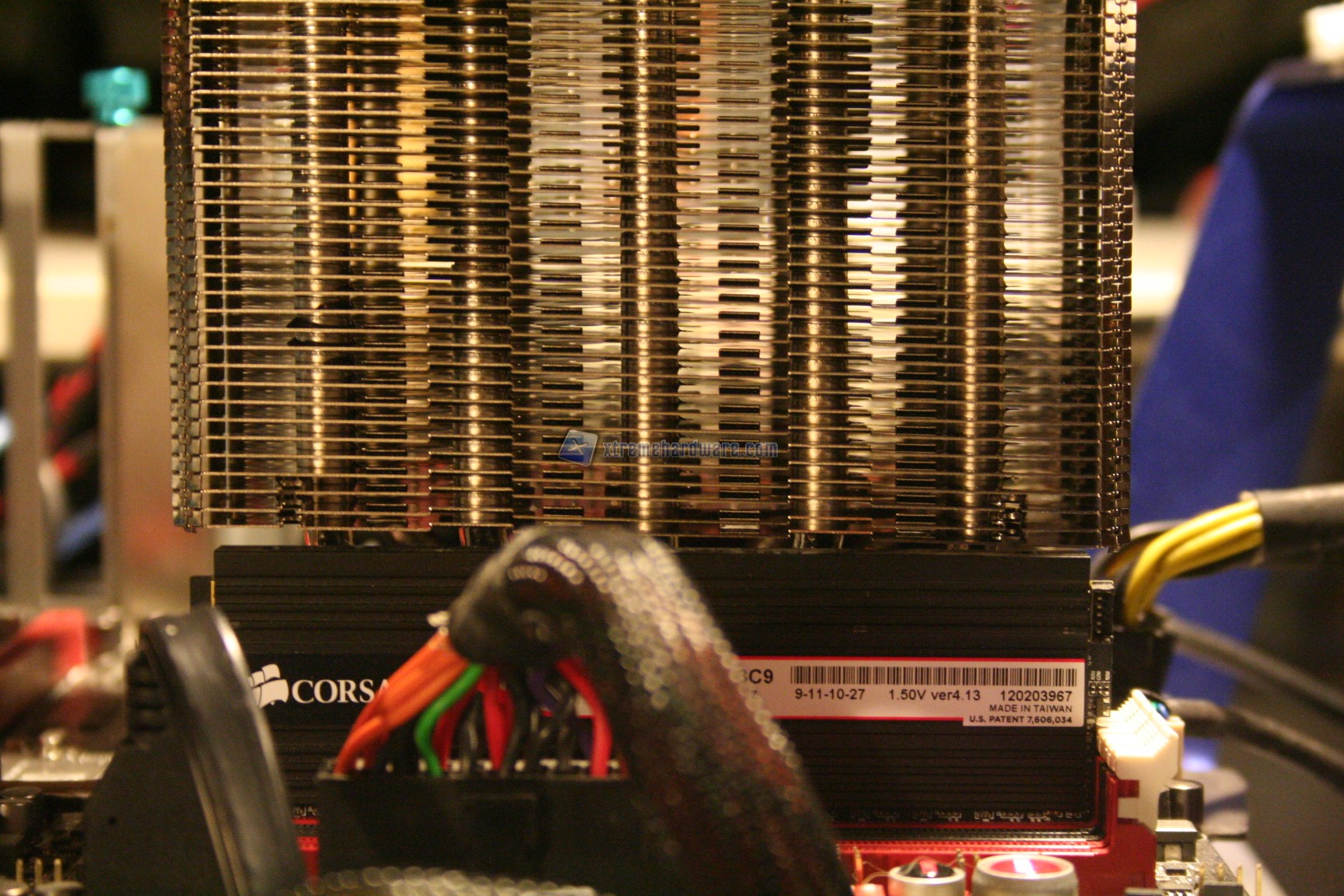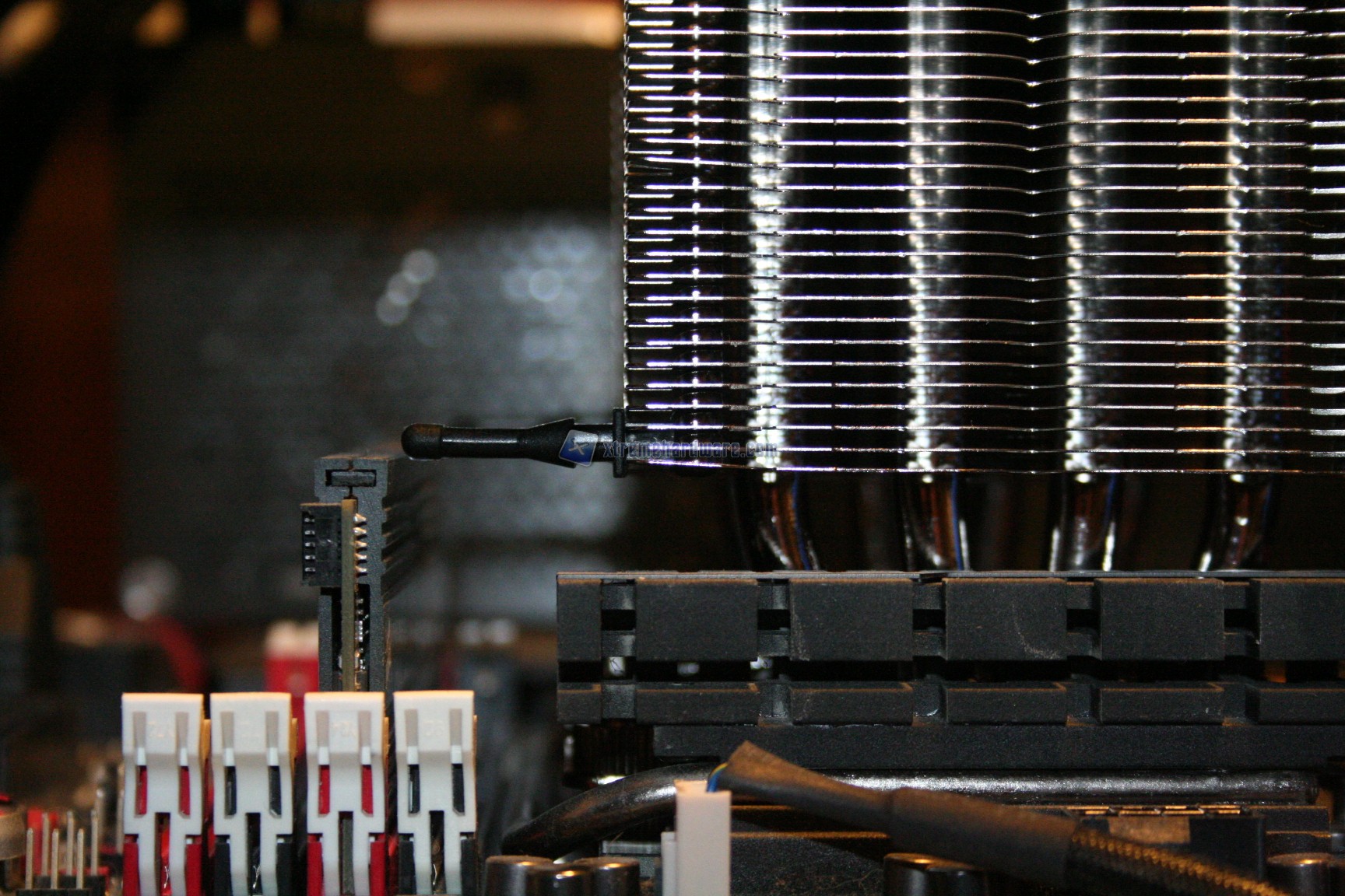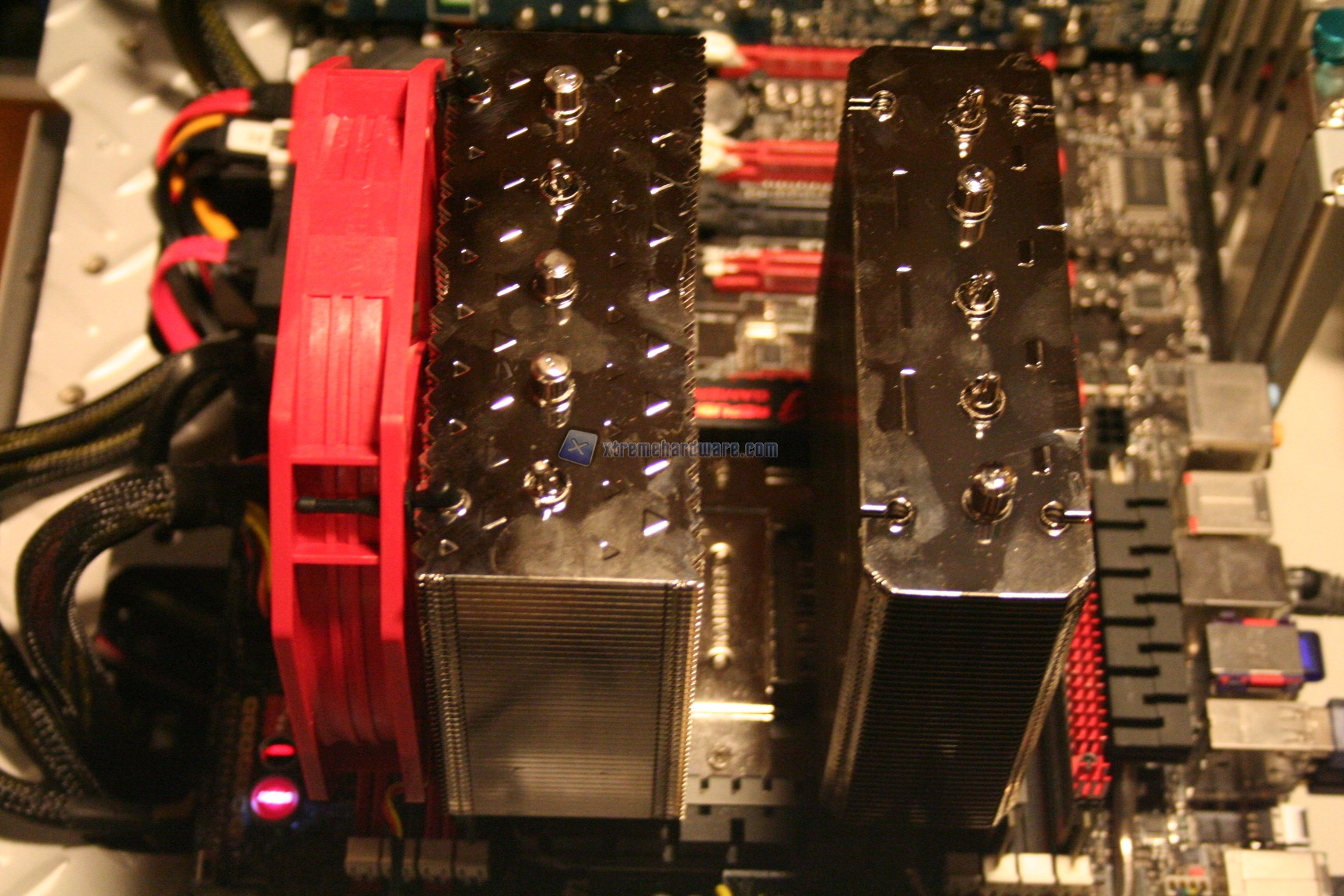 Sarebbe stato preferibile un sistema di fissaggio delle ventole regolabile in altezza, meno intrusivo e più gestibile. Vengono occupati i primi due slot, a causa dell’elevato spessore del dissipatore. Nella seguente foto ad esempio potete notare che è stato spostato un banco di RAM dal secondo al primo slot, comportando anche problemi nella rilevazione dello stesso banco: