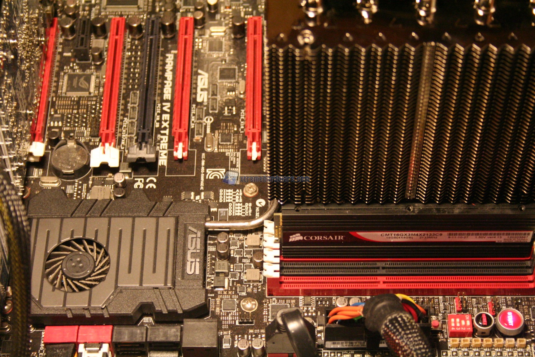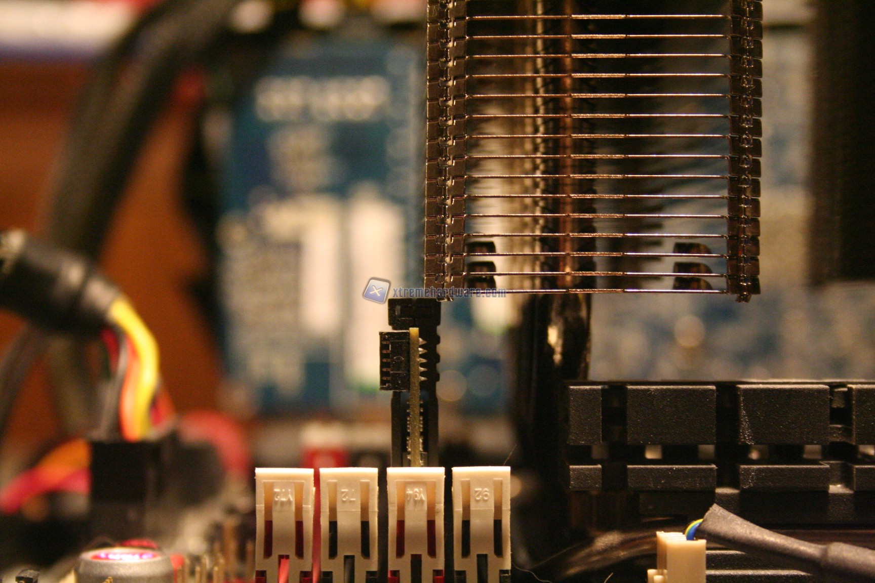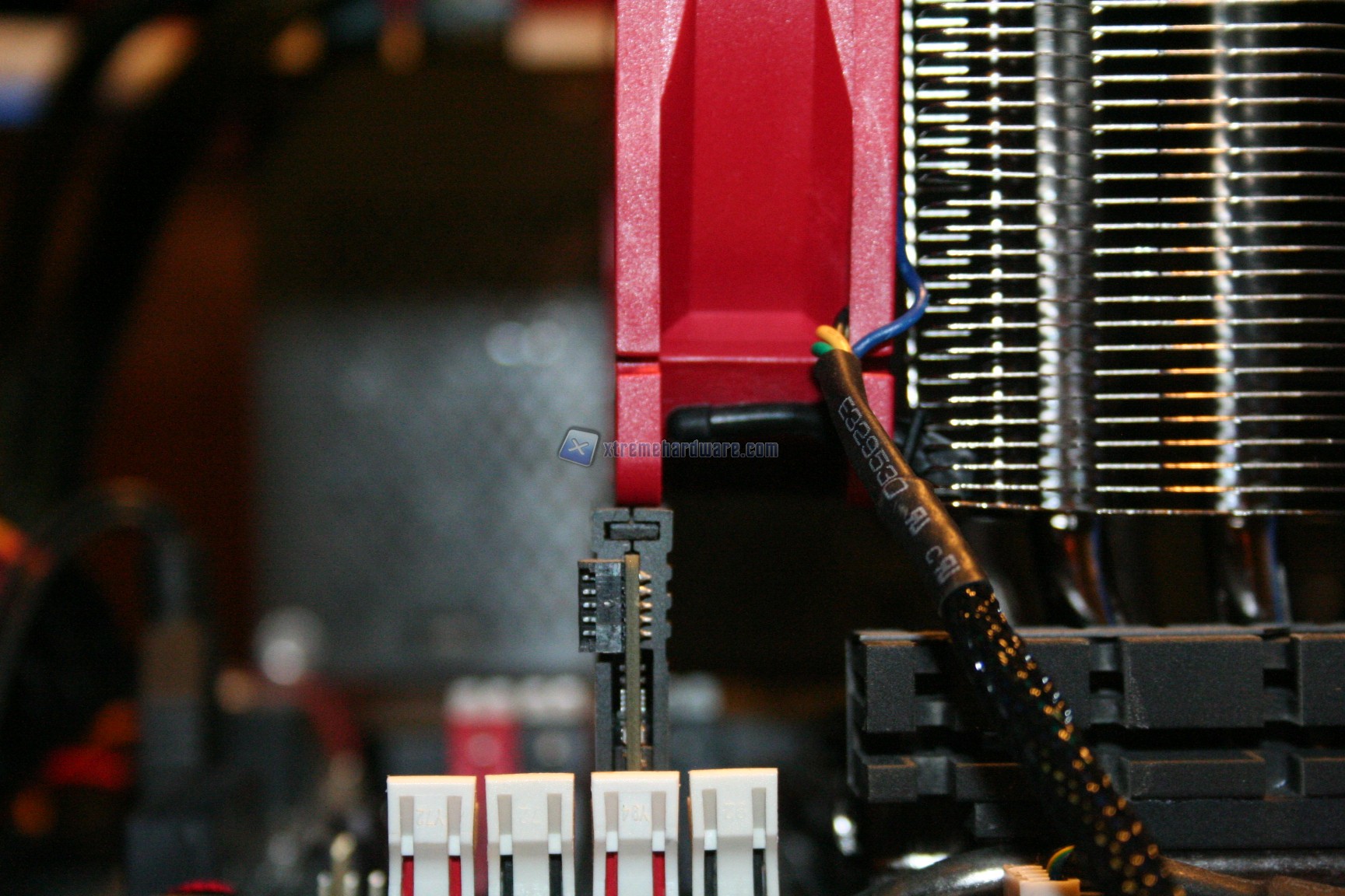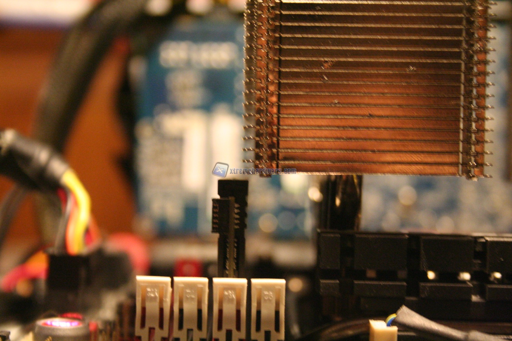 Sarebbe stato preferibile un sistema di fissaggio delle ventole regolabile in altezza, meno intrusivo e più gestibile. Vengono occupati i primi due slot, a causa dell’elevato spessore del dissipatore. Nella seguente foto ad esempio potete notare che è stato spostato un banco di RAM dal secondo al primo slot, comportando anche problemi nella rilevazione dello stesso banco: