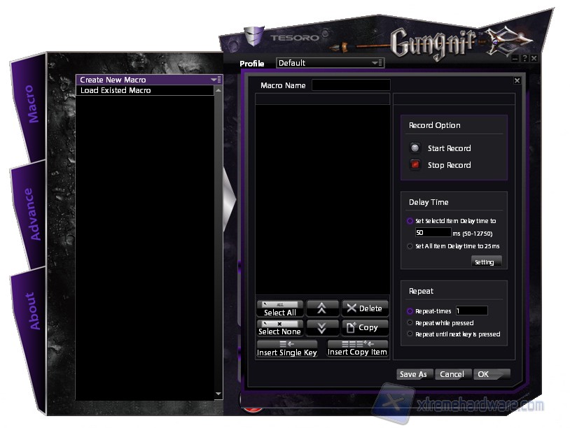 Usando la freccia laterale sinistra possiamo espandere il menù dei driver, da cui ci appaiono tre nuove Tab. Macro è la Tab dedicata alla creazione delle macro, i passaggi per costruire la propria macro sono abbastanza intuitivi ed è possibile editare la sequenza generata sotto ogni aspetto.