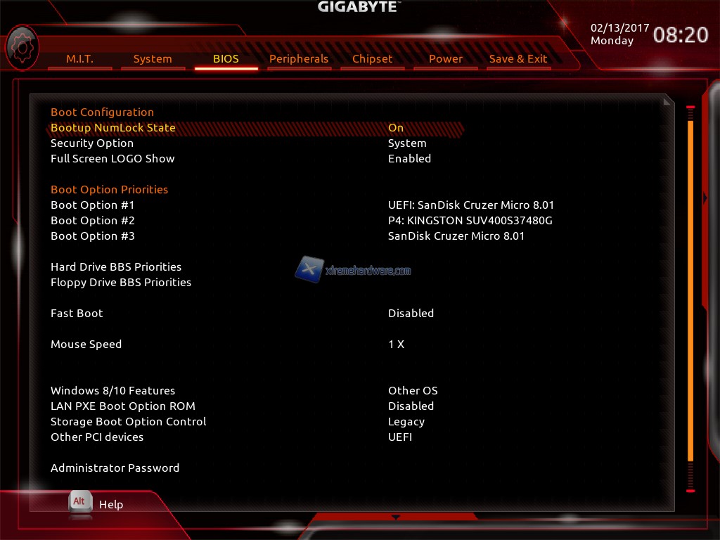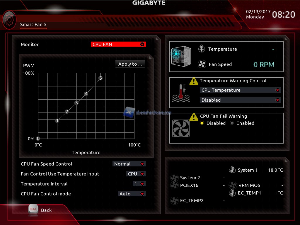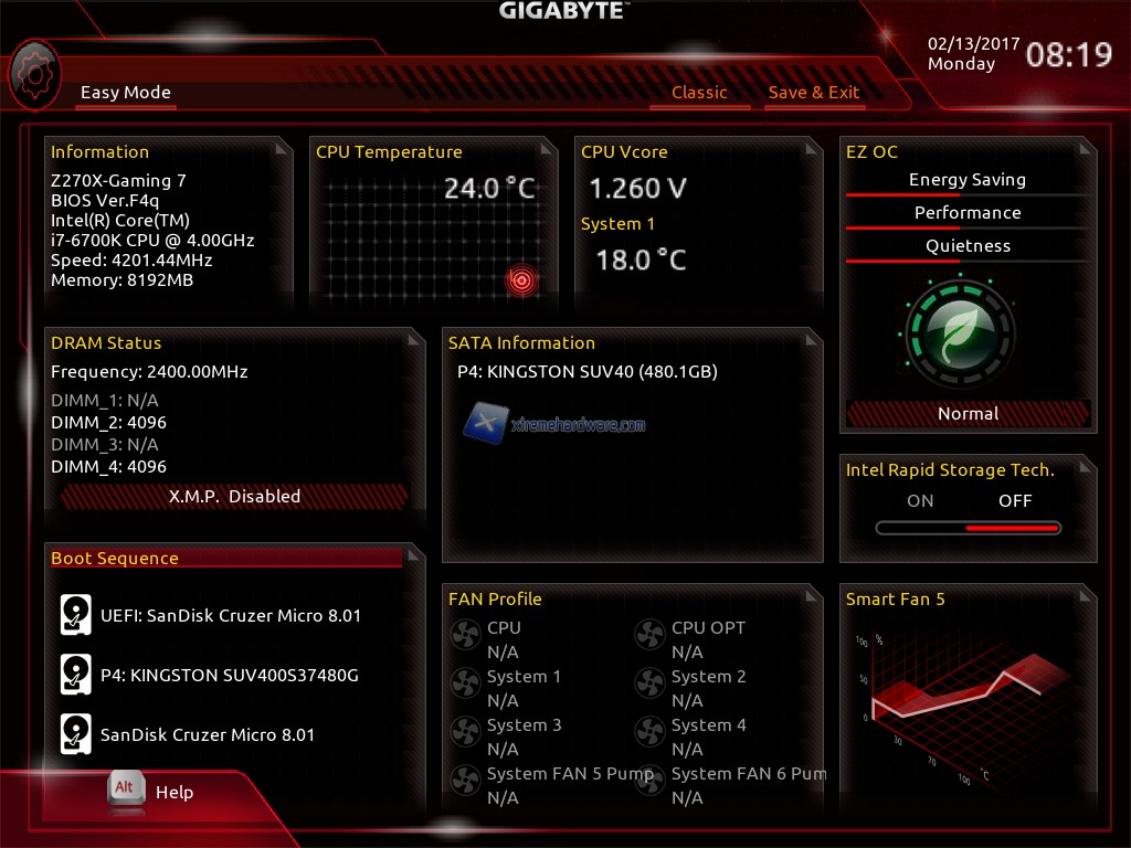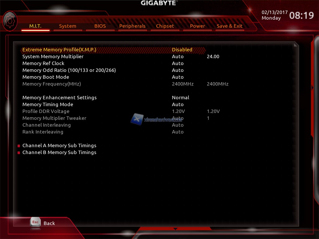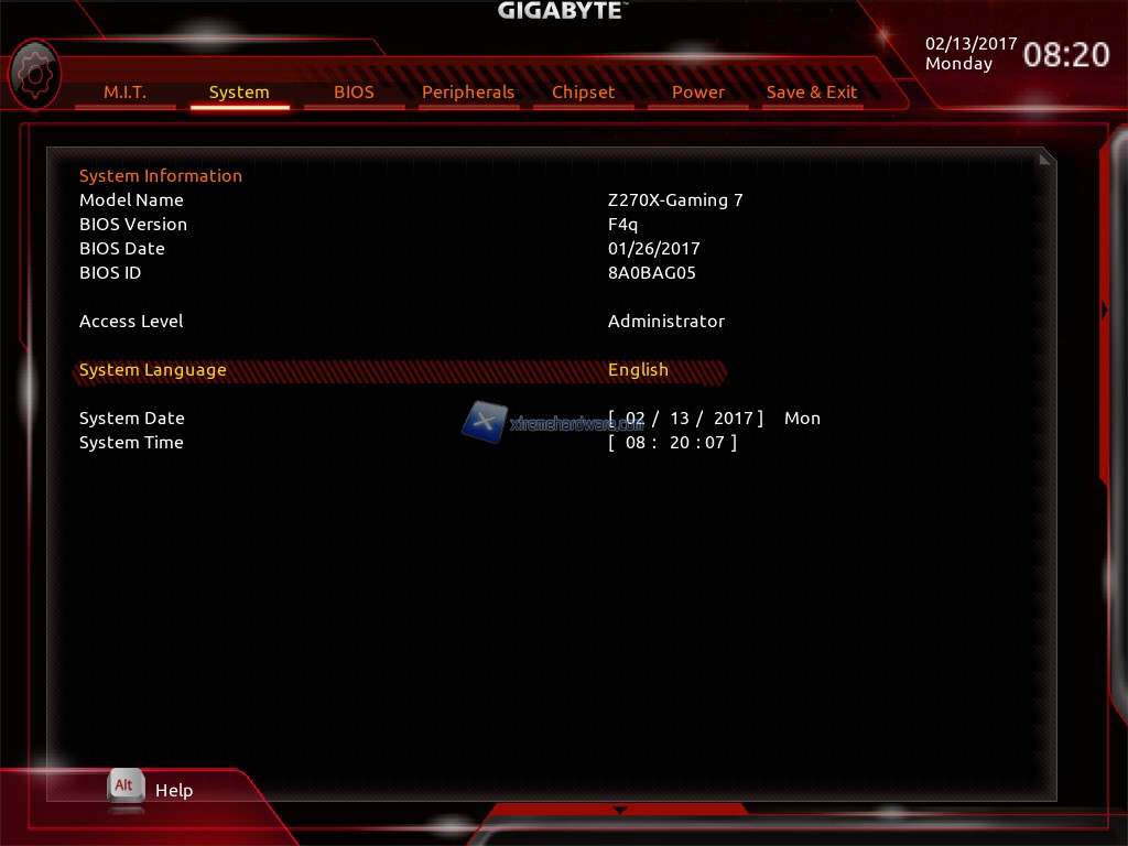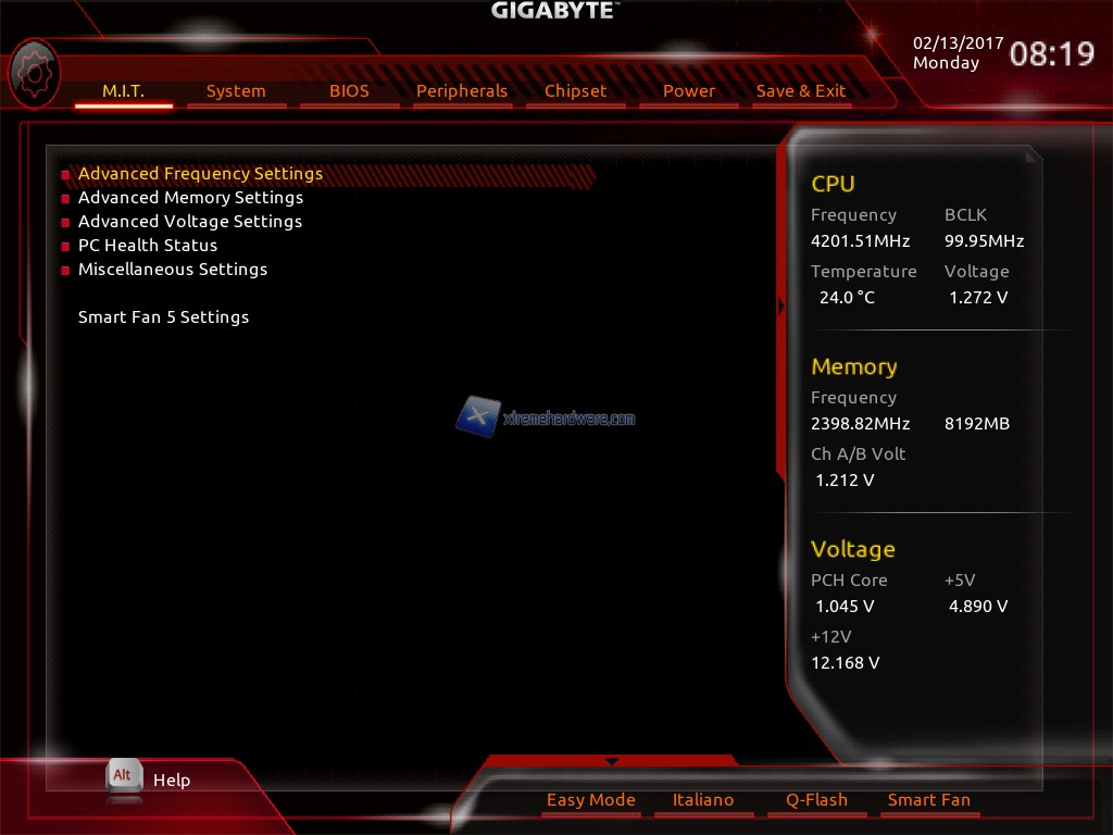 Una volta entrati nel BIOS della GIGABYTE AORUS Z270X-Gaming 7 ci troveremo di fronte sempre un BIOS di tipo UEFI, grafica in colorazione Nero/Rosso scuro e layout al solito veloce e intuitivo. Interfaccia già vista con altri modelli.