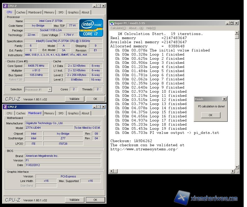 Siamo riusciti a concludere i 10 cicli di test alla frequenza di ben 4801,4 MHz e considerando che stiamo parlando di una cpu di classe Ivy Bridge, la frequenza raggiunta è ottima. Soffermatevi sul valore computazionale di picco, ben 110,93GFlops (secondo solo alla MSI Z77 Mpower), conseguenza dell’ottimo lavoro svolto sia da Intel sul processore Ivy Bridge che ne ha potenziato l’ALU sia dell’ottima sezione di alimentazione della Z77X-UD4H, di vecchia scuola ma caratterizzata da un’eccellente stabilità.