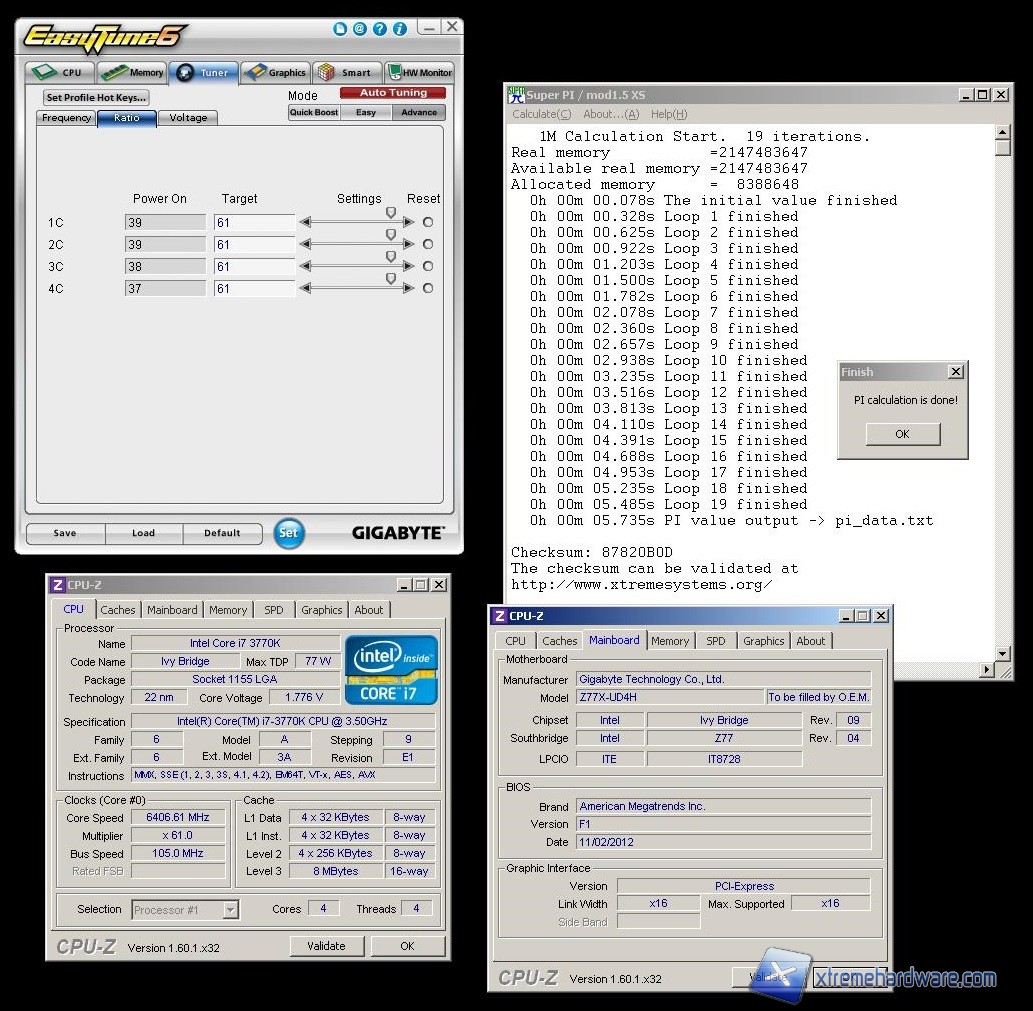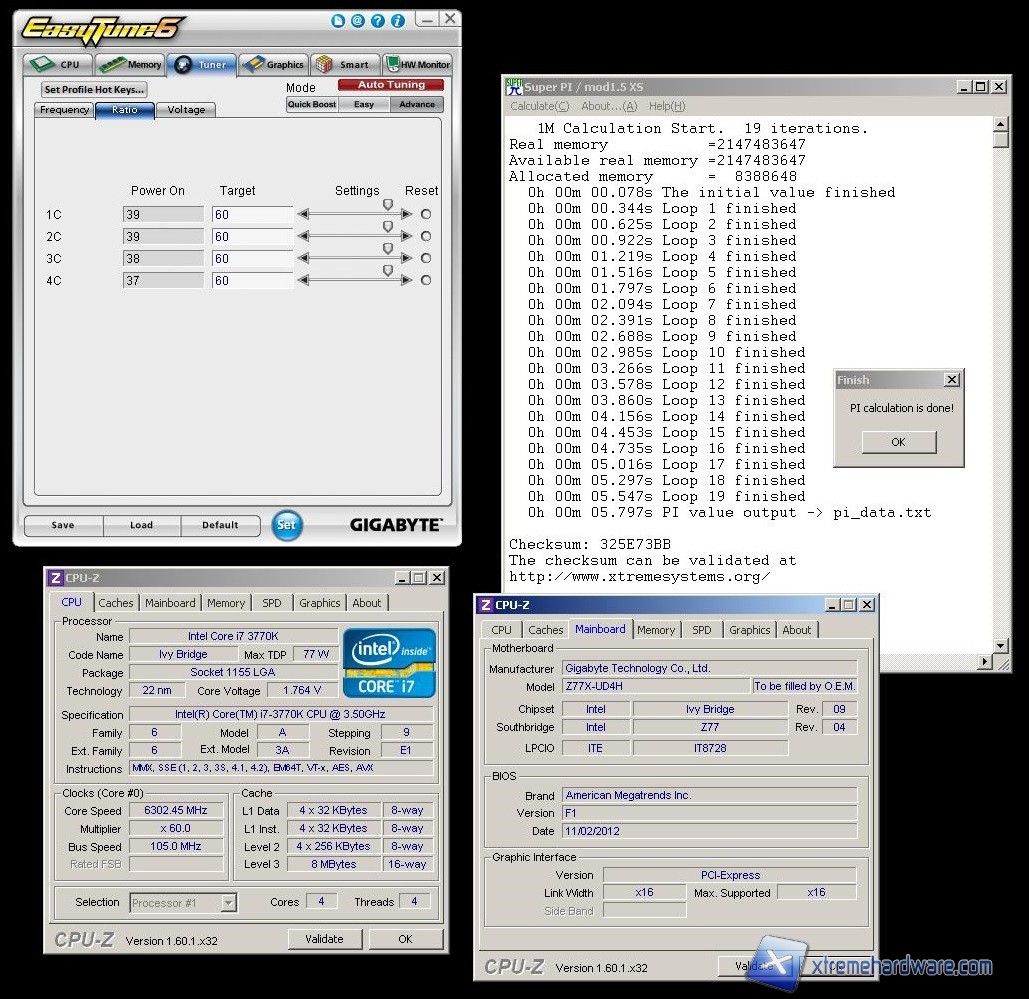 Passiamo adesso a test più impegnativi. Chi ci segue sa bene che la passione che ci unisce per l’informatica in generale ci spinge a testare l’hardware anche con la pratica dell’overclock ed a sottoporlo a test con sistemi di raffreddamento estremo. Abbiamo sottoposto la Z77X-UD4H a test non convenzionali (o almeno non alla portata di tutti) e ne abbiamo verificato la tenuta utilizzando come sistema di raffreddamento l’azoto liquido, in modo da non esser frenati dal tipo di raffreddamento adottato e poter portare al limite la sezione di alimentazione della scheda madre spingendo il processore e le memorie ad operare a frequenze e tensioni proibitive. In aiuto per chi effettua l’overclock è disponibile il noto tool della Gigabyte: EasyTune giunto alla 6 versione. Con questo programma è possibile intervenire da Windows, quindi in tempo reale, sui valori di frequenza e voltaggio del processore e della memoria interagendo anche sul Bclk. Non abbiamo avuto nessun problema a fare il boot con il Bclk impostato come in figura a 105 ed a 108, ma non è stato possibile modificare tale parametro tramite il tool EasyTune. Probabilmente questo problema verrà risolto con le prossime versioni di BIOS e del tool. Commentiamo adesso assieme i risultati ottenuti: