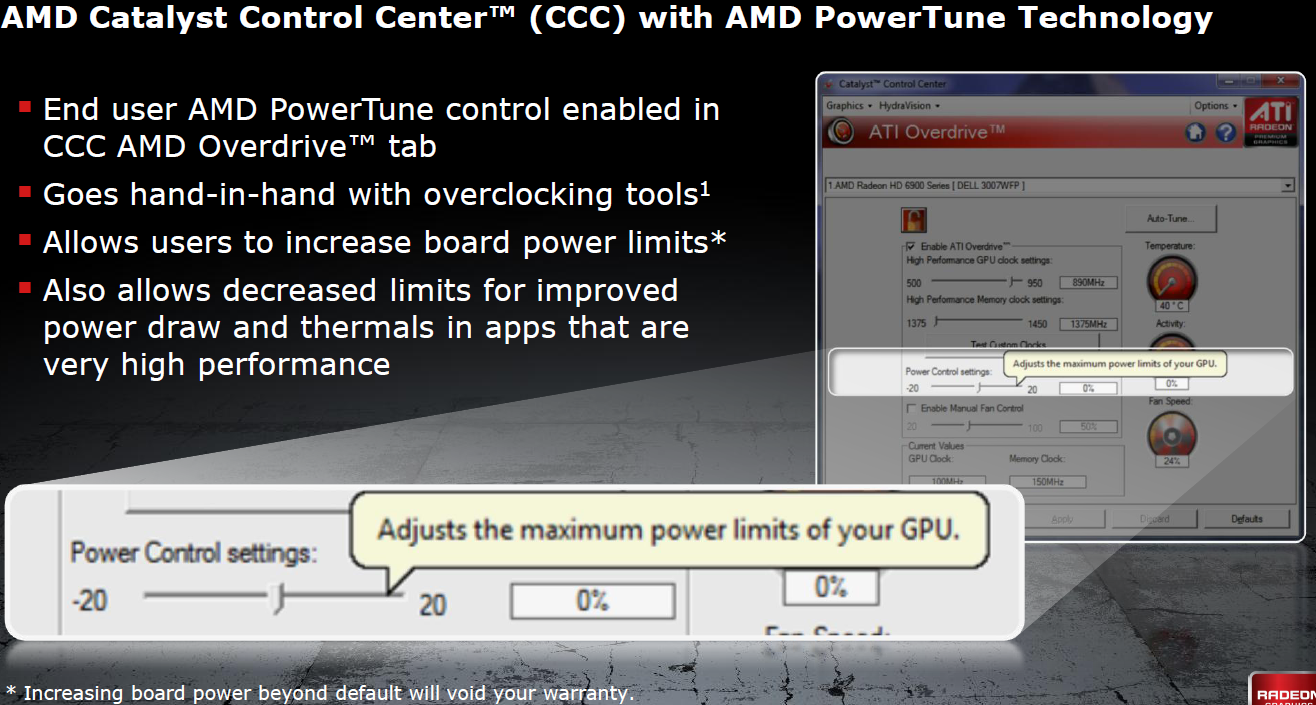 Un ulteriore vantaggio del PowerTune è la maggior libertà lasciata all’utente. Tramite il pannello dei driver Catalyst sarà infatti possibile regolare la soglia di guardia del TDP entro un margine di +/- 20%. Gli utenti che desiderano mantenere il sistema più silenzioso e quindi più fresco possono abbassare la soglia del TDP in modo da regolare dinamicamente il sistema verso frequenze più basse. D’altro canto, gli utenti che dispongono di migliori sistemi di dissipazione possono scegliere di aumentare il TDP in modo da massimizzare le prestazioni della scheda. In una nota AMD specifica però che tale operazione porta a invalidare la garanzia della scheda. Questa dichiarazione ci lascia con qualche perplessità poiché non è chiaro come sarà possibile effettuare l’overclock della scheda senza aumentare la soglia del TDP e quindi invalidare la garanzia. Aumentare le frequenze massime di clock senza aumentare la soglia del TDP avrebbe un impatto prestazionale piuttosto contenuto poiché, una volta superata la soglia del TDP, il sistema PowerTune le abbasserà automaticamente. In merito a ciò attendiamo ulteriori sviluppi e i risultati dei test in overclock.
